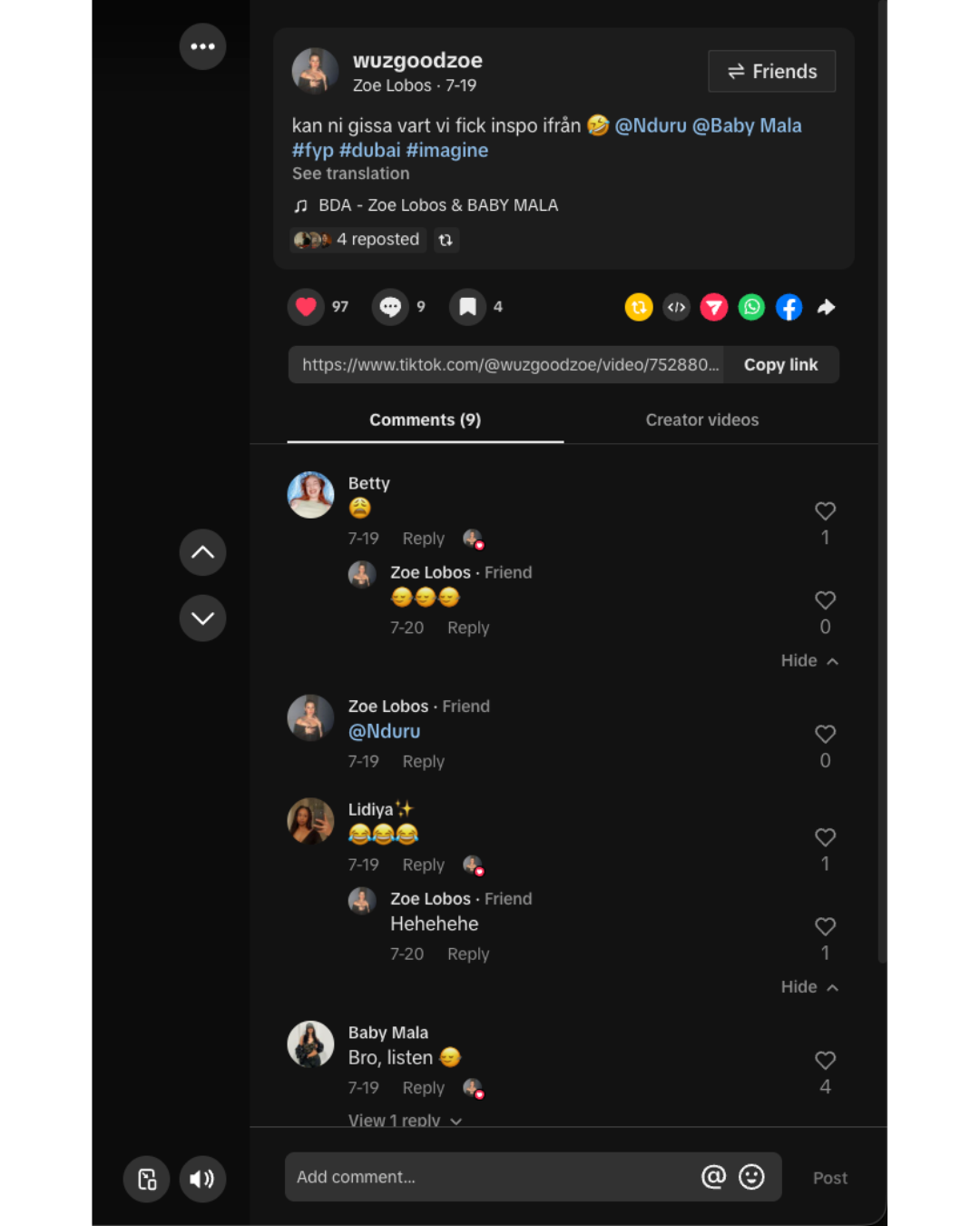 Zoe Lobos featuring Baby Mala's single "BDA" from 2025 where we defined by a unique concept centered around a banana, designed to resonate with a broader audience. We partnered with the sticker company Stickers App to distribute stickers throughout Stockholm, engaging with the public by interviewing them about what "BDA" signifies to them. The campaign primarily targeted TikTok, where both Zoe and Mala have their significant following.